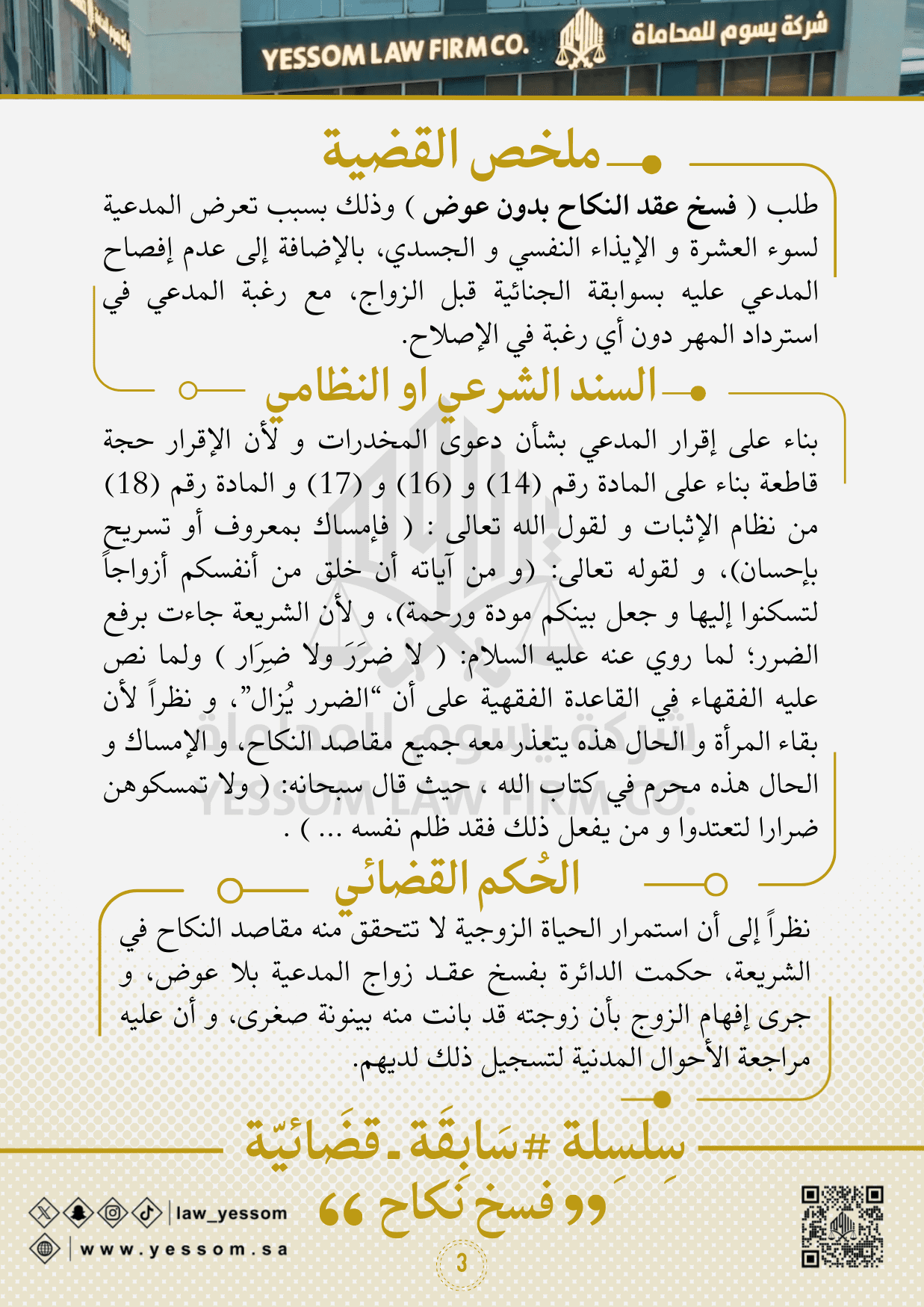 ترى شركة يسوم للمحاماة أن قضايا فسخ النكاح بسبب التعاطي تمثّل نموذجًا واضحًا لتفاعل القضاء السعودي مع متغيرات المجتمع. إذ يوازن القاضي بين حق الزوجة في الأمان النفسي والاجتماعي، وبين مبدأ العدالة الشرعية الذي يحمي الأسرة من الظلم.